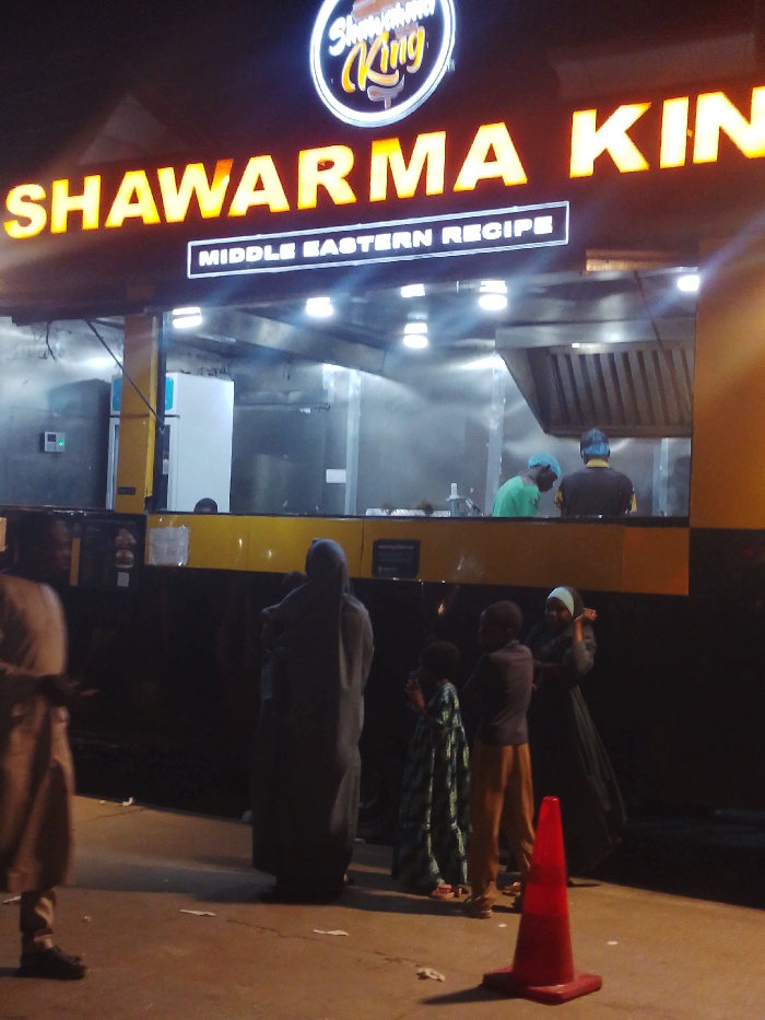 A street scene at night shows a "Shawarma King" food truck with a lit sign