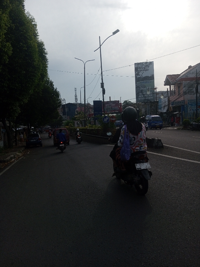 This image depicts an urban street scene in San Pya, Myanmar, characterized by active traffic and mixed commercial and residential structures under an overcast sky. In the foreground, a person wearing a black helmet, a black head covering, and a patterned long-sleeved shirt with white and colorful abstract shapes (red, blue, green, yellow) rides a scooter away from the viewer. A purple bag containing white items is secured to the back of the scooter's seat. The scooter's license plate, "F 3717 ZI" with "16-23" beneath it, is clearly visible on the rear fender. The vehicle is positioned on the right side of an asphalt road. Along the left side of the road, a dense line of dark green trees runs parallel to the street. Further ahead on the asphalt, several other motorcycles and a red vehicle, possibly an SUV or MPV, are visible. One motorcycle rider in a blue shirt is prominent further down the road on the left. Faint figures of pedestrians can be seen on the sidewalk or shoulder beyond the trees on the far left. To the right of the foreground scooter, a low concrete barrier or divider separates traffic lanes. Buildings with varied architecture, including some with red-tiled roofs and one with pink walls, line the right side of the street. A tall billboard displays the word "AVAILABLE" and "Jaya" above an image of a landscape, with phone numbers including "021 451 1110," "0816 1907 238," and "0812 9136 8000." Utility poles with multiple wires traverse the upper portion of the frame, alongside several streetlights mounted on tall poles. A blue van is visible further down the road on the right. In the background, what appear to be communication towers and industrial structures are silhouetted against the bright, overcast sky. The overall scene suggests a busy city environment during daylight hours, likely late afternoon or an overcast day.