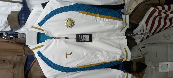 A white jacket with blue and gold accents, featuring a circular emblem on the upper left chest