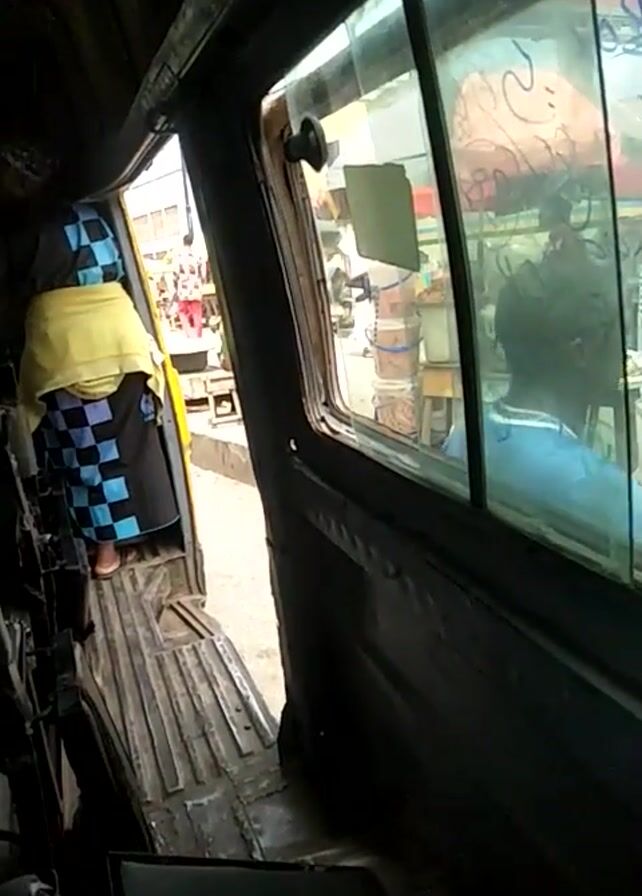 From a low angle inside a vehicle with a partially open sunroof, a person in a black and white shirt and jeans can be seen moving about, seemingly adjusting something within the vehicle. A second person with a yellow covering lies horizontally inside the vehicle. The interior is unfinished. The camera angle and movement suggest someone inside the vehicle is recording the scene. Outside, a brightly lit area with a yellow object is visible, suggesting an external environment. The overall setting appears to be in a state of disrepair or renovation.