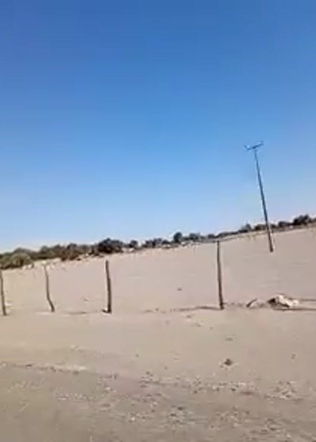bright, sunny, arid landscape with a clear blue sky. A sandy area is fenced with wooden posts, some of which are broken or leaning. Beyond the fence, sparse vegetation and scattered structures are visible. The camera appears to be moving, capturing the scene in motion. The scene appears desolate and sparse.