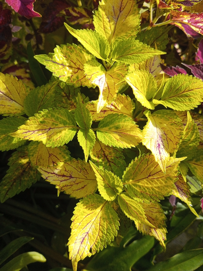 The image displays a close-up, top-down perspective of a vibrant plant, reportedly located in Salai Har Htan, Myanmar. The central subject is a dense cluster of foliage, characterized by numerous ovate to lanceolate leaves with serrated edges. The leaves exhibit a striking variegated pattern: a predominant chartreuse to bright yellow-green base color accented by distinct reddish-purple or maroon venation that extends across the leaf surface. Some leaves feature a broader, paler purple blush centrally. Strong, directional natural light from the upper right illuminates the leaves, highlighting their color and texture, while casting shadows that add depth. The background is out-of-focus, showing blurred forms of darker green and burgundy-colored foliage. No individuals, animals, or man-made structures are visible.
