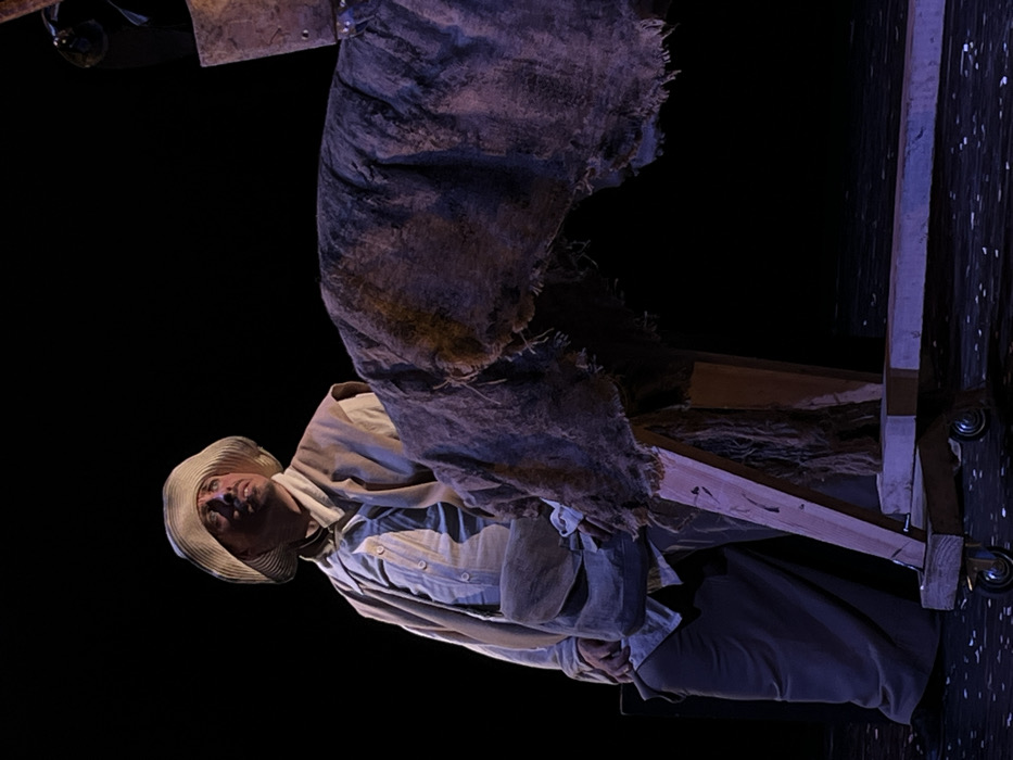 This image, located in Novoshakhtinsk, Russia, displays a theatrical scene featuring one male individual and a prominent stage prop on a dark stage. The man, positioned on the left, wears a wide-brimmed, light-colored straw hat, a light-colored collared shirt, an open, sleeveless tan vest or jacket, and dark, loose-fitting trousers. A light-toned pouch is visible on his left hip. He is looking upwards and to his left, with his mouth slightly open. To the right, a large prop is covered with a dark, roughly textured fabric, possibly burlap, exhibiting frayed edges. This fabric drapes over a wooden support structure, which includes a wooden base fitted with small casters, indicating mobility. A small, dark, reflective or metallic object is partially visible in the upper right quadrant, above the fabric-covered prop. The background is uniformly black. The floor is dark with scattered small, light-colored debris. Directed lighting illuminates the man and the prop, creating defined highlights and shadows.