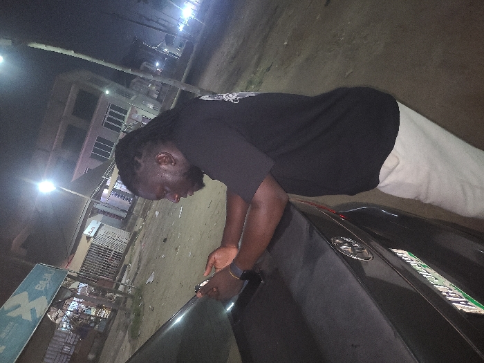 In a dimly lit outdoor setting, a man leans over a black car. He has dreadlocks and wears a dark t-shirt and light-colored pants. His face is oriented towards the car's window as he appears to be using a small, handheld device. In the background, there is a building with multiple windows and a brightly lit sign. Streetlights cast a glow on the scene. The car's emblem is visible on the hood, and part of the license plate can be seen.