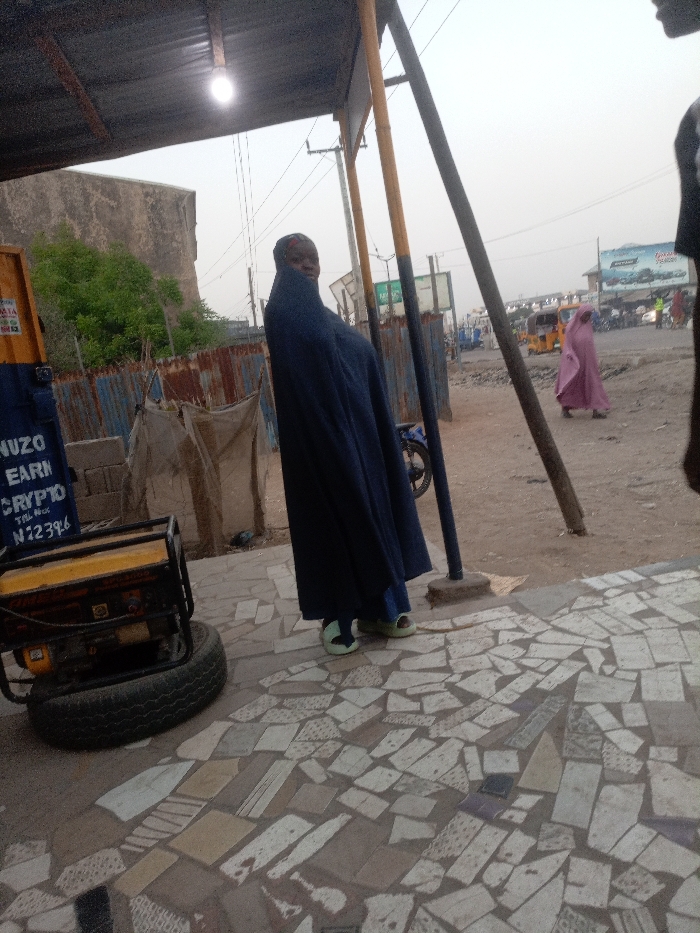A woman in a dark blue abaya stands near a utility pole on a sidewalk with mosaic tiles. An electrical generator rests on a tire to the left. Behind the woman, there's a corrugated metal fence and some vegetation. In the background, a woman in a pink robe walks along a dusty street with other vehicles and pedestrians. A sign with a vehicle advertisement is also visible in the distance.