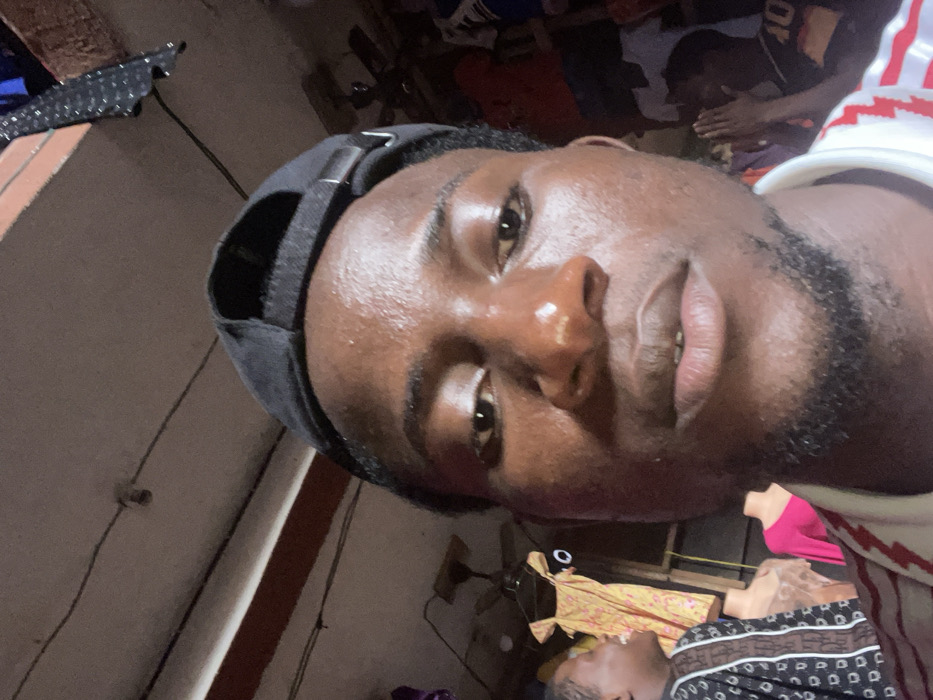 The scene depicts an interior retail environment, specifically a clothing stall or shop in Fegge, Nigeria. The primary subject is a young Black male positioned close to the camera, wearing a black baseball cap reversed and a white shirt with red stripes. His face appears reflective, possibly due to perspiration or direct lighting. In the background on the left, a second individual, a young Black male, is partially visible, wearing a dark patterned shirt and smiling with an open mouth, looking towards the left. Behind him, a yellow patterned dress is displayed on a mannequin, with a ceiling fan visible above. On the far right, a third individual is partially obscured, wearing a dark top and holding their hands clasped together. Various other items of clothing are visible throughout the background, some hanging and some displayed on mannequins, including a pink top. The ceiling shows exposed wiring and structural elements.