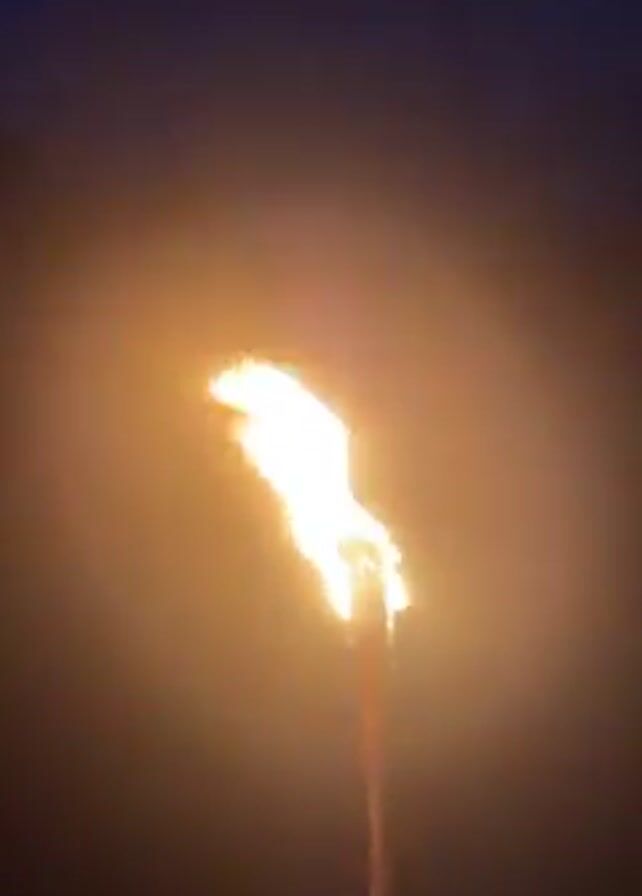 A flame burns on a stick, illuminating the darkness. The flame is bright and dances in the air, surrounded by a soft, hazy glow. The stick holding the flame is simple and unadorned, extending upwards into the darkness. The environment is dark, with a hint of blue suggesting it is night or dusk.