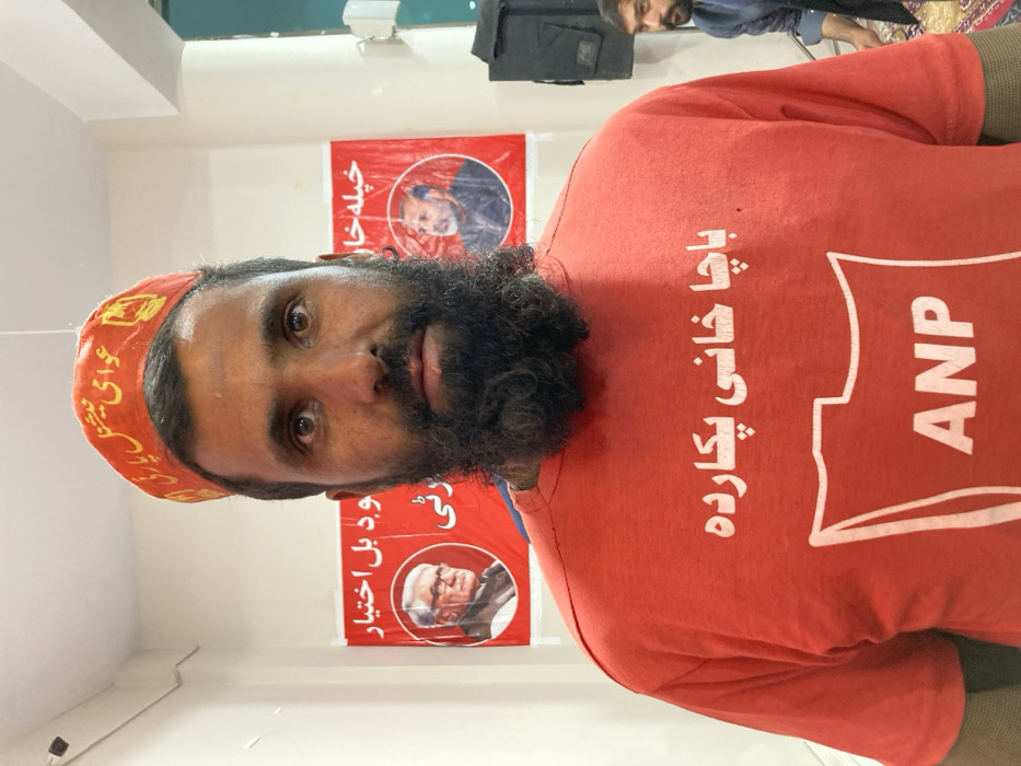 An adult male with a dark beard and mustache is depicted in a head-and-shoulders shot, facing forward. He wears a red t-shirt displaying white Pashto text "باچا خانی پکارده" (Bacha Khani Calls) and an "ANP" (Awami National Party) logo. A red cap with yellow script "عوامی نیشنل پارٹی" (Awami National Party) is worn on his head. The background features two red political banners mounted on a light-colored wall. The banner on the left exhibits a circular portrait of an elderly man with glasses, with partial Urdu/Pashto text "خود بل اختیار". The banner on the right displays a circular portrait of another male figure and partial Urdu/Pashto text "خپله خا". A second male individual is partially visible to the right of the primary subject. The setting is an indoor event, consistent with a political gathering, located in Quetta City Tehsil, Pakistan.