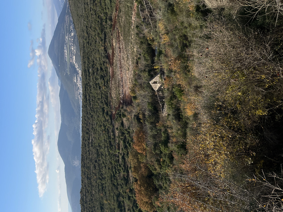 The image presents a panoramic view of a landscape within the vicinity of the city of Dubravcevina, Montenegro. The foreground is filled with dense, autumnal vegetation, featuring shrubs and trees with leaves exhibiting yellow, orange, and brown coloration, mixed with green. In the midground, a partially collapsed stone structure, appearing to be a derelict building without a roof, stands amidst the overgrown terrain. To the right of this ruin, an expanse of exposed reddish-brown earth indicates disturbed ground. Beyond, dark green scrubland and scattered trees cover undulating hills, extending towards a body of water in the distant background. A mountain range rises across the water, upon whose slopes a settlement of light-colored buildings is visible. The sky above is clear blue with scattered white clouds. No individuals, animals, or active subjects are depicted in the frame.