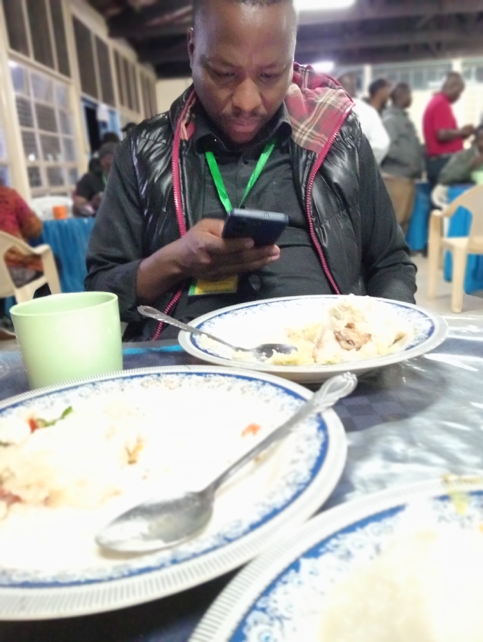 A man is seated at a table with multiple plates of food and a green cup. He is looking down at a cell phone in his hands. He is wearing a black shirt, a black vest with a red plaid hood, and a green lanyard around his neck. Other people can be seen sitting at tables in the background. The focus is on the man and his phone at the table.