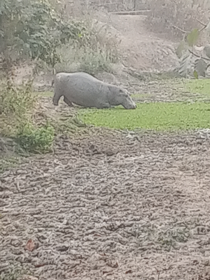 - "A hippopotamus rests on green vegetation amidst a muddy landscape" by FM-q4R863, licensed under CC BY 4.0