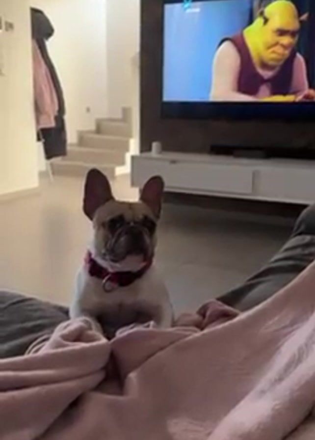 A person is lying on a couch with a pink blanket, watching a movie on TV. The movie features the character Shrek. A French bulldog with a pink collar is sitting on the person’s lap. The dog looks at the camera, then jumps off the couch. The camera follows the dog as it tumbles off the couch onto the floor. There is a white staircase visible in the background. The house is white.