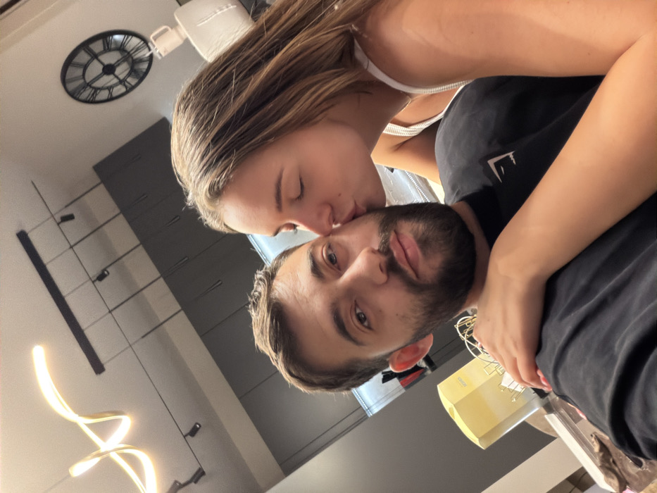 The scene is an indoor, close-up, selfie-style photograph taken in a modern residential setting within the city of Unknown, Unknown. Two individuals are present. In the left foreground, a male with dark hair, a trimmed dark beard, and mustache looks directly at the camera with a neutral expression. He wears a dark t-shirt with a white stylized logo on the left chest. His left arm is positioned out of frame, indicative of holding the camera. To his right, a female with long brown hair, wearing a white ribbed tank top, is shown with her eyes closed, kissing the male's right cheek. Her left arm is wrapped around his shoulders. The background reveals a contemporary interior. Dark grey, flat-panel cabinets are visible across the left and center. The white ceiling features several artificial light sources: a curved, abstract yellow-glowing fixture in the upper left, a black linear track light with multiple spotlights extending horizontally, and a black linear fixture with several small drop lights. A large, round, black skeletal wall clock with Roman numerals is mounted on the upper right wall. On a light-colored surface in the lower left, a pale yellow, sloped-top box, partially labeled "DOMINUS," is visible. A white, stylized, mug-like object rests on a surface in the upper right background, below the clock. The environment is uniformly lit by artificial lighting.