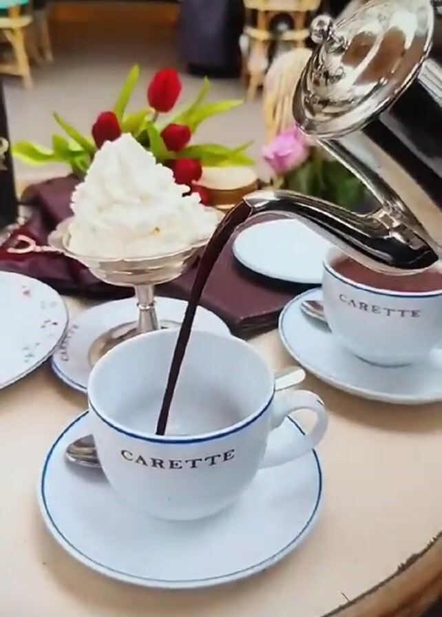 table at a cafe with two cups of hot chocolate being poured from a silver teapot. The cups are white with a blue rim and the name "CARETTE" written on them. There is also a small dish of whipped cream and a bouquet of red tulips on the table. People are visible in the background, sitting at other tables. The teapot is silver and reflects the light. The hot chocolate being poured is dark brown. The table is light colored and appears to be made of wood.
