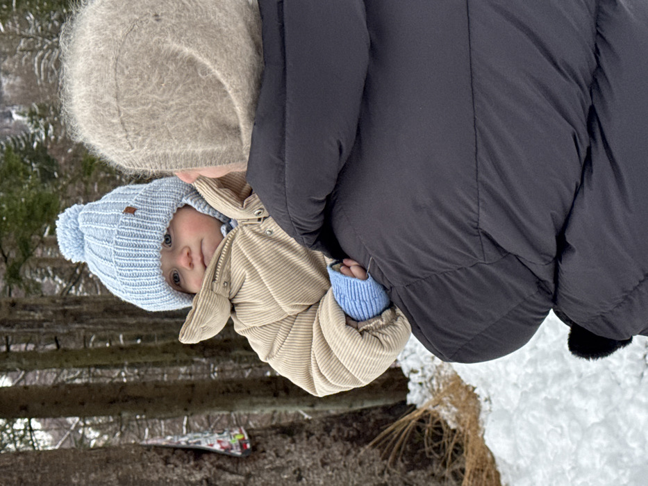 - "A baby in a light blue beanie with a pom-pom and a beige corduroy jacket is held by an adult wearing a light brown knit hat and a black puffer jacket" by FM-SHEMl1, licensed under CC BY 4.0