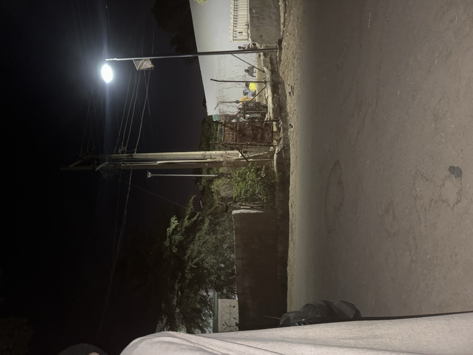 The image depicts a nighttime street scene in Gandu Albasa, Nigeria. The foreground on the left shows a partial view of a light-colored garment, possibly a sleeve or robe, and a dark object, potentially part of a vehicle. The road surface, which occupies the lower half of the frame, is asphalt or dirt, displaying light and dark patches. In the midground, on the left, a low, light brown wall is visible, topped with a dark, spiky barrier, likely razor or barbed wire. Green foliage partially obscures this wall and extends behind it. A building with a white exterior is situated behind the foliage. Central to the midground is a tall utility pole with numerous overhead wires. To its right, a brightly illuminated street light on another pole casts light onto the scene; a small, dark rectangular object is affixed to this pole below the light. Further to the left, a second, dimmer street light is visible. To the right of the utility pole, a rusty or dark brown metal gate, with an open or partially obscured entry, stands next to a section of chain-link fence. Behind this fence and gate, a group of approximately four to five individuals is observed sitting or squatting on a raised ground area. At least one person is wearing a bright yellow shirt. Their specific actions or interactions are not discernible beyond their seated presence. On the far right, a white wall or building section is visible. The sky is dark, indicating night, with faint stars faintly visible. The overall environment suggests an urban or semi-urban setting with infrastructure for power and lighting.