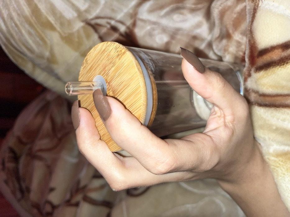 A hand with dark brown, pointed nails holds a glass tumbler. The tumbler has a bamboo lid with a clear glass straw extending from its center. The hand wraps around the tumbler with fingers visible on both sides. The background consists of a blurred, beige and brown patterned blanket. The focus is on the hand and the tumbler.