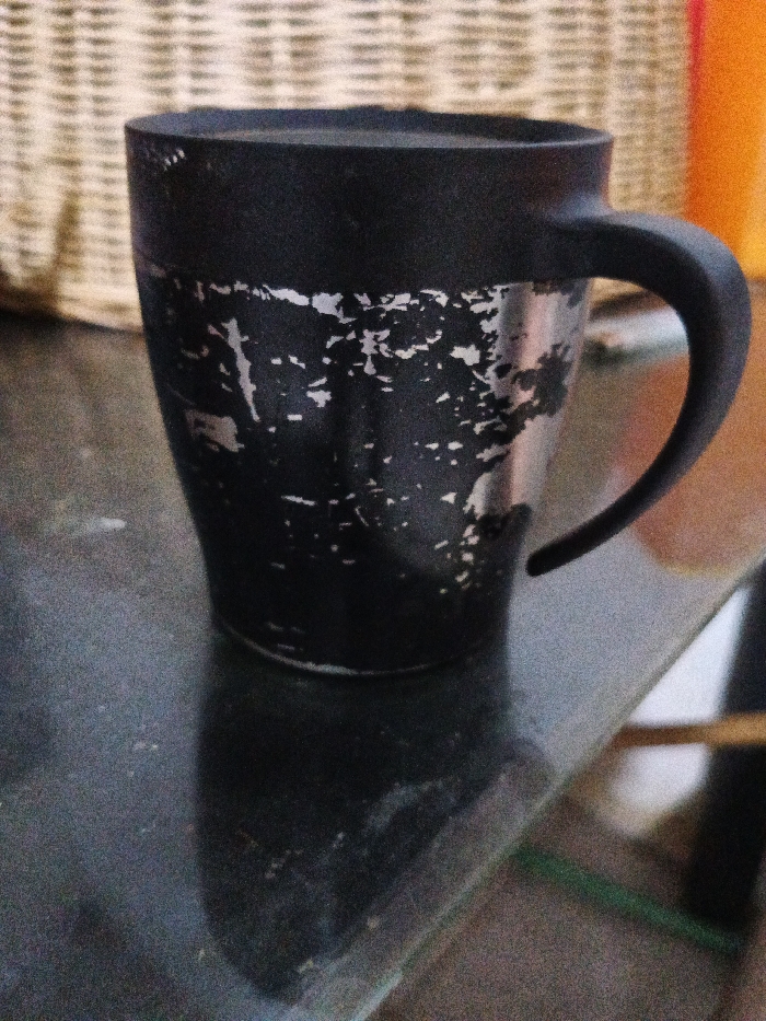 A single, black cylindrical mug with a matching C-shaped handle is positioned on a dark, reflective surface, likely glass, exhibiting a clear reflection of the mug below it. The mug's exterior displays significant wear, with extensive chipping of the black outer coating, revealing an underlying silver or metallic material in an irregular, mottled pattern across its body. The top rim and handle remain uniformly black. In the background, a light-brown, woven texture, resembling wicker or rattan, is visible directly behind the mug, with blurred orange and lighter tones further to the right. The scene is located in Lhokseumawe, Indonesia. No individuals or active interactions are present.