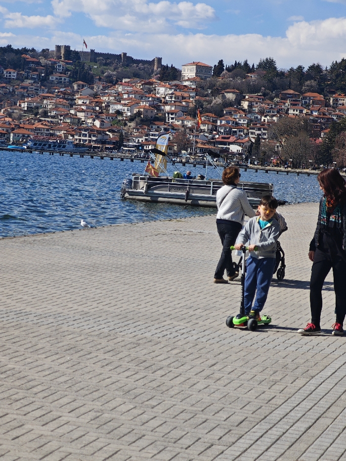 The image presents a sunlit daytime scene on the paved promenade adjacent to Lake Ohrid, with the historic city of Ohrid and Samuel's Fortress occupying the background hillside in North Macedonia. In the foreground, a light-colored paved pathway, textured with a diagonal rectangular pattern, extends across the lower half of the frame. A young boy, wearing a grey hooded sweatshirt, blue trousers, and yellow-tinted glasses, stands astride a green and black three-wheeled scooter, oriented towards the left. To his immediate right, an adult female with dark hair, dressed in a dark long-sleeved top, dark leggings, and red sneakers, stands partially obscured, facing generally forward. Behind the boy, an adult female, viewed from the back, wears a light-colored sweater and dark trousers while pushing a dark stroller. The midground consists of the blue waters of Lake Ohrid, exhibiting light ripples. A white seagull stands on the paved edge next to the water on the left. A grey pontoon-style boat with a canopy, displaying yellow and red flags, is visible on the lake, carrying several indistinct individuals. A long pier structure with multiple smaller vessels is discernible further across the water. The background is dominated by a densely developed hillside, characteristic of Ohrid's old town, featuring numerous structures with orange-red tiled roofs interspersed with vegetation, including trees with white or pink blossoms. At the hill's apex, the stone walls and towers of Samuel's Fortress are prominent, with a flag, likely Macedonian, flying from one of its battlements. The sky is bright blue with scattered white cumulus clouds. The scene is illuminated by strong sunlight, casting visible shadows.