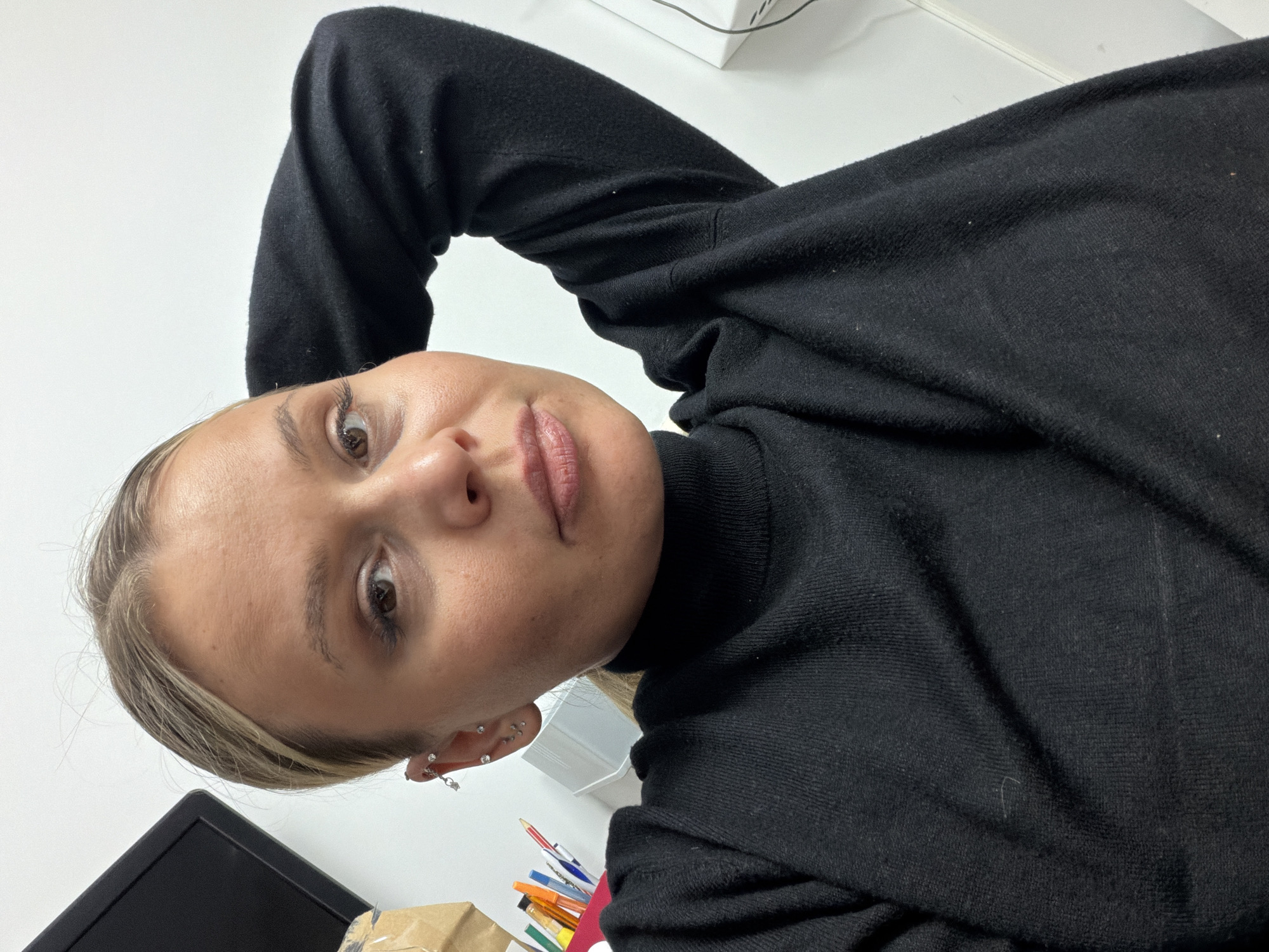 A woman is lying down in what appears to be an office setting. She is wearing a black turtleneck sweater and has her arm bent behind her head. Her hair is blonde and pulled back. She has multiple earrings in one ear. In the lower left corner of the frame, there is a black computer monitor. To her right, there are pens and a package on a desk. The background is a plain white wall. There is no indication of the location being Sarapul, Russia.