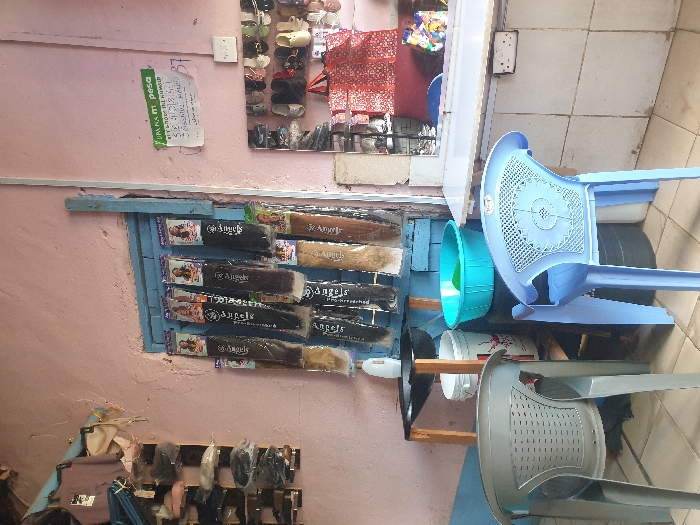 The scene is an interior shot, likely a store. Hair extensions on a blue wall hang above a display of items in bags. Two plastic chairs, one light blue and one light gray, are stacked near a teal basin. The floor is tiled. In the background, shoes are displayed on a shelf. A paper sign is affixed to the wall. The photo appears to be rotated to the side.