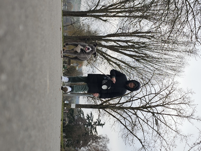 The image displays an outdoor scene captured from a low perspective on a paved pathway in Bech-Kleinmacher, Luxembourg. A young adult individual walks forward on the path, accompanied by a dog on a leash. The person, with the hood of a dark jacket or coat pulled up, wears dark green pants and white athletic shoes, and exhibits a smiling facial expression. A black shoulder bag with a prominent white circular logo is worn across their front. The dog, a grey and white short-haired breed resembling an American Staffordshire Terrier, walks to the individual's left, with its tongue slightly extended. The leash extends from the person's right hand to the dog's collar. In the midground and background, numerous tall, deciduous trees with bare branches line the area, indicating a season without foliage. To the left, a body of water is visible, with distant green hills or landforms beyond it. The sky is overcast and light grey.