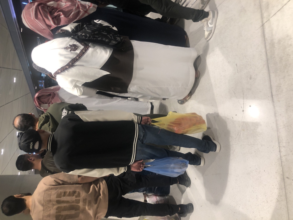 The image depicts an indoor public waiting area or queue in a modern facility in Riyadh, Saudi Arabia