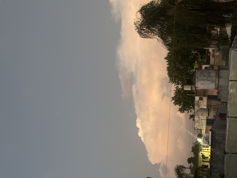 This image depicts an urban or suburban landscape in Bernal Este, Argentina, observed during late evening or twilight. The upper portion of the sky is a muted blue-grey, gradually transitioning downwards to a large formation of cumuliform clouds illuminated with warm orange and pink hues, indicative of sunset light. In the upper-center left of the blue-grey sky, two distinct, small white points of light are visible, consistent with bright celestial objects such as planets or stars. Below the cloud formation, a dense cluster of low-rise buildings with flat roofs is visible, many appearing weathered. Several cylindrical white water tanks are prominently situated on these rooftops. Green foliage from trees is interspersed among the buildings, with a large palm tree dominating the right side of the frame, its fronds silhouetted against the sky. Artificial yellow light sources are discernible among the structures, suggesting active streetlights or interior building illumination. The immediate foreground is obscured by a dark, indeterminate structure, possibly a wall or another rooftop. No individuals are present, and no actions or interactions are depicted within the scene.