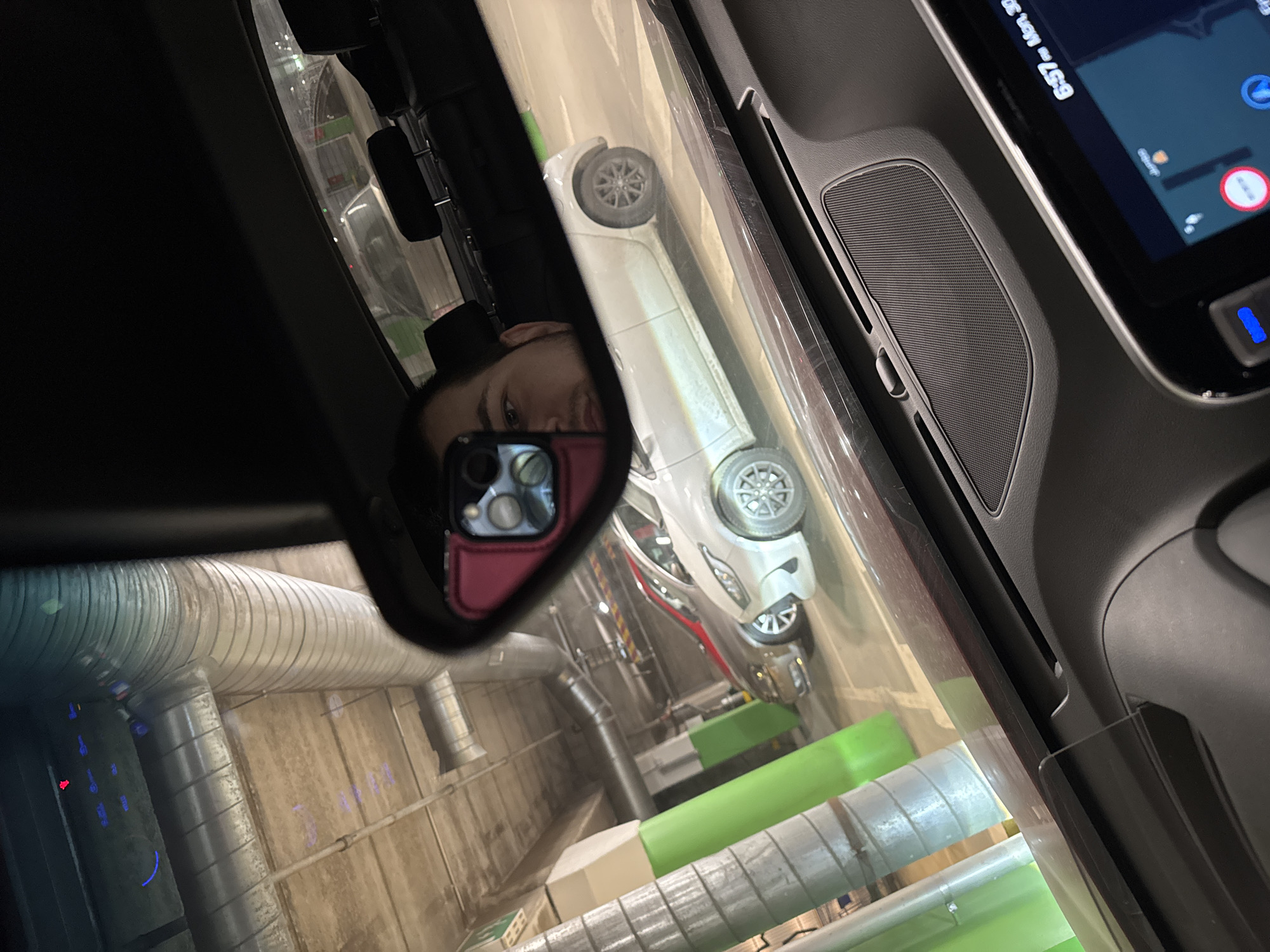 view from inside a car, with the side mirror reflecting the driver and the parking garage environment. The car is parked in a garage with exposed pipes and green structures, which are characteristic of the parking garages in Vantaa, Finland. A white car, partially visible in the mirror's reflection, is parked next to it. The infotainment screen of the car displays the current time, 6:57 AM, and the date, Monday, March 25th. The driver's face is also reflected in the side mirror, showing them holding a phone. The scene is captured from the driver's seat, offering a view of the surrounding environment and the car's interior.