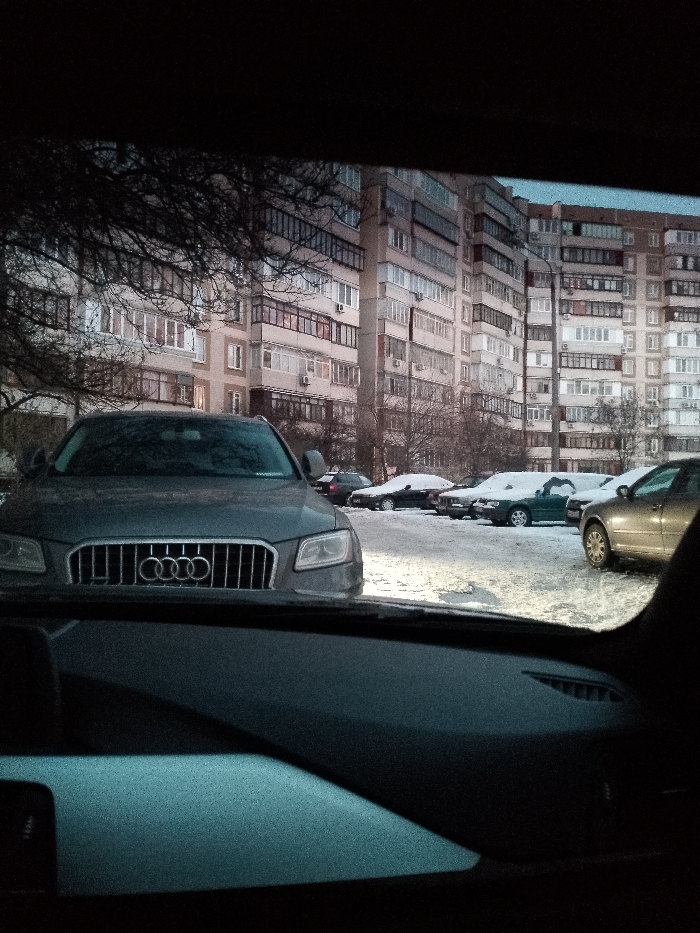 The image, captured from the interior of a vehicle looking outward through the windshield, depicts a snowy residential scene in Kyiv, Ukraine, likely during dusk or dawn. The foreground reveals the dark dashboard of the viewer's vehicle. Directly ahead, a dark grey Audi Q5 SUV is parked, facing the camera, with its grille and headlights prominently visible. To the right of the Audi, a snow-covered parking lot extends, containing multiple other vehicles, including a dark green sedan and a gold-colored sedan, all partially covered in a light layer of snow. The ground is uniformly covered in snow, with bare tree branches visible on the left. In the background, a cluster of large, multi-story residential apartment buildings, characteristic of Soviet-era or post-Soviet architecture common in Kyiv, dominates the skyline. These buildings feature numerous windows and balconies, some enclosed, and visible air conditioning units. No individuals are visible in the scene.