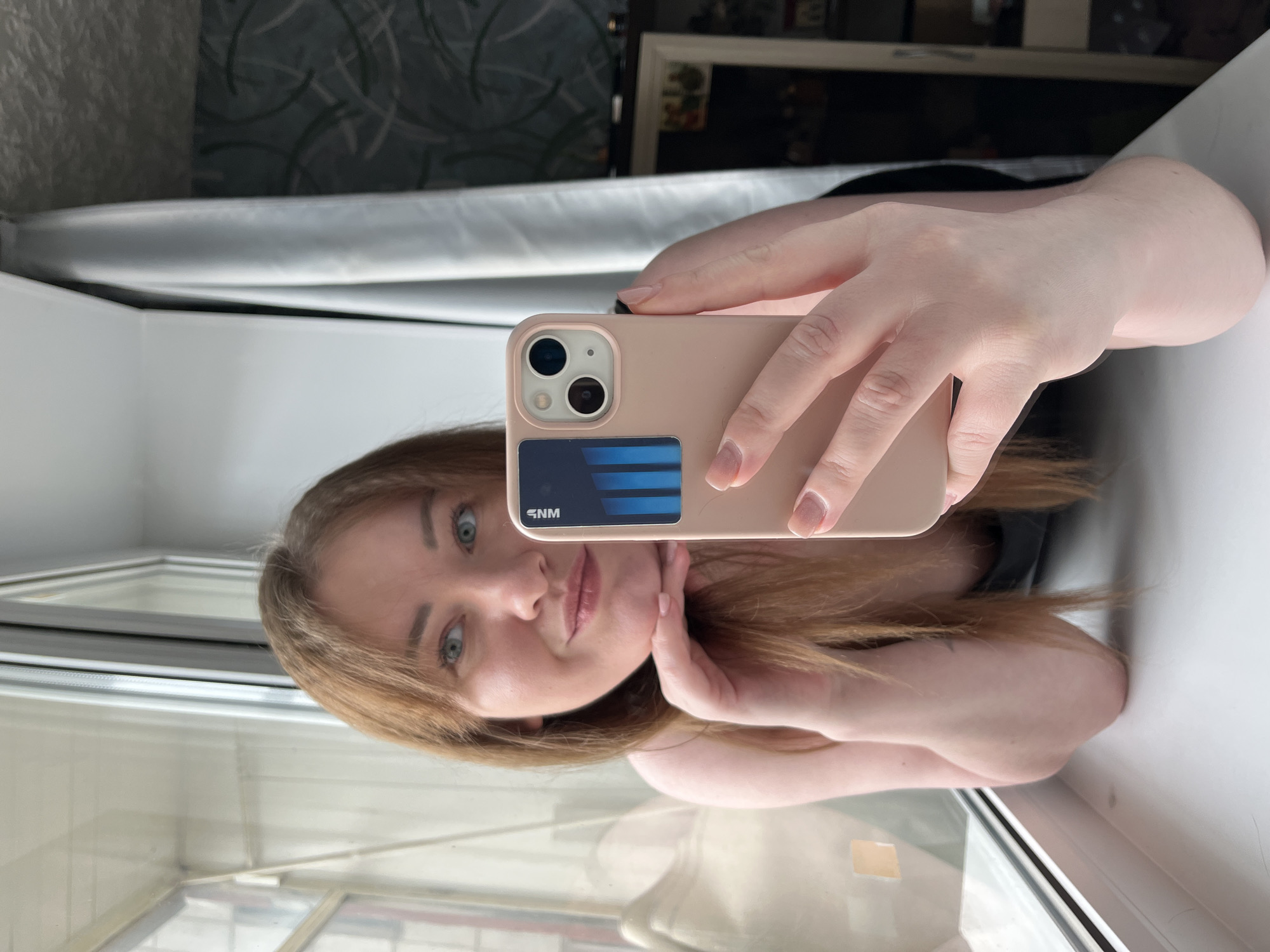A woman is taking a selfie indoors. She is holding a peach-colored iPhone with a dark blue card on the back. The woman has light brown hair and blue eyes. She is resting her chin on her hands. The background includes a window with a white frame and partially visible curtains. A picture or framed item is visible in the reflection on the window. The location is Chaikovsky, Russia.