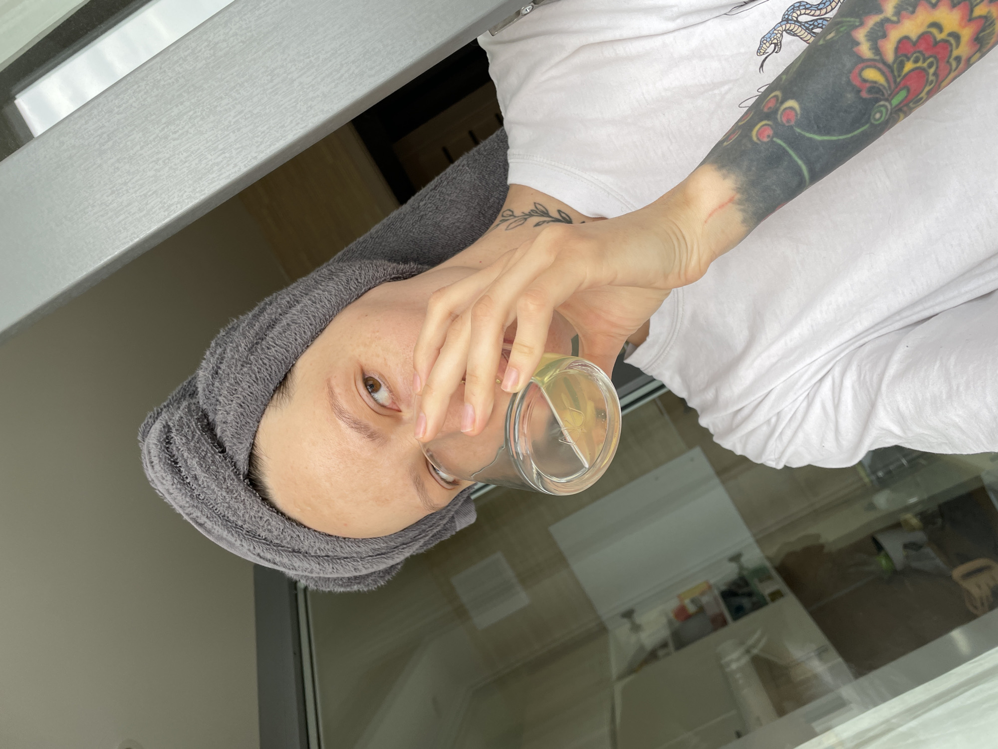 A woman with a gray towel wrapped around her head is drinking from a glass, likely indoors near a window. She wears a white t-shirt and has tattoos on her arm. The scene is a close-up, focusing on the woman and the glass. There's no information available to determine the location as Izhevsk, Russia.