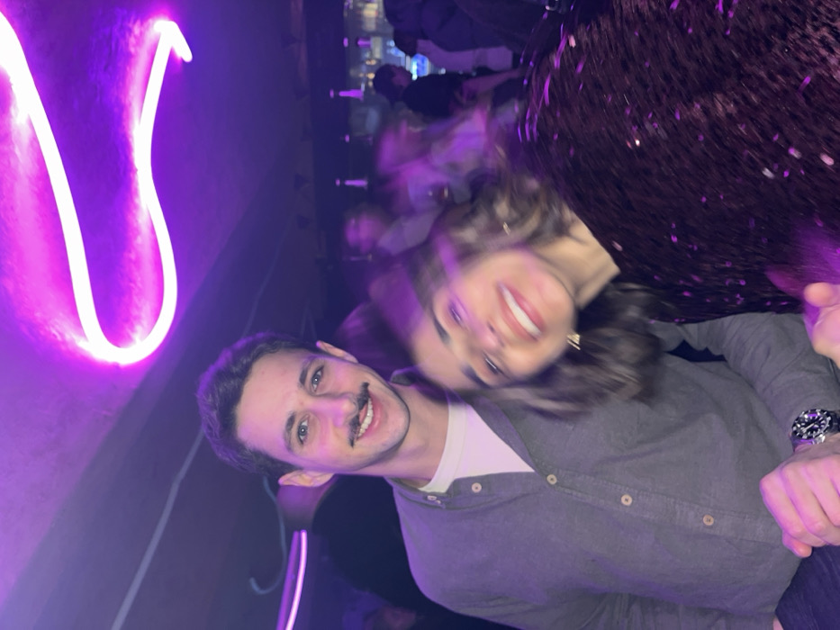 A group of people, mainly a couple, are illuminated by purple lights in what seems to be a nightclub. The man is wearing a gray button-up shirt, while the woman is wearing a dark, sparkly top. The woman appears to be moving, resulting in a blurred effect. There's a neon light display in the background shaped like a vertical wave. Other people are present in the background but are blurred. The overall impression is that the photo was taken during a lively night out.