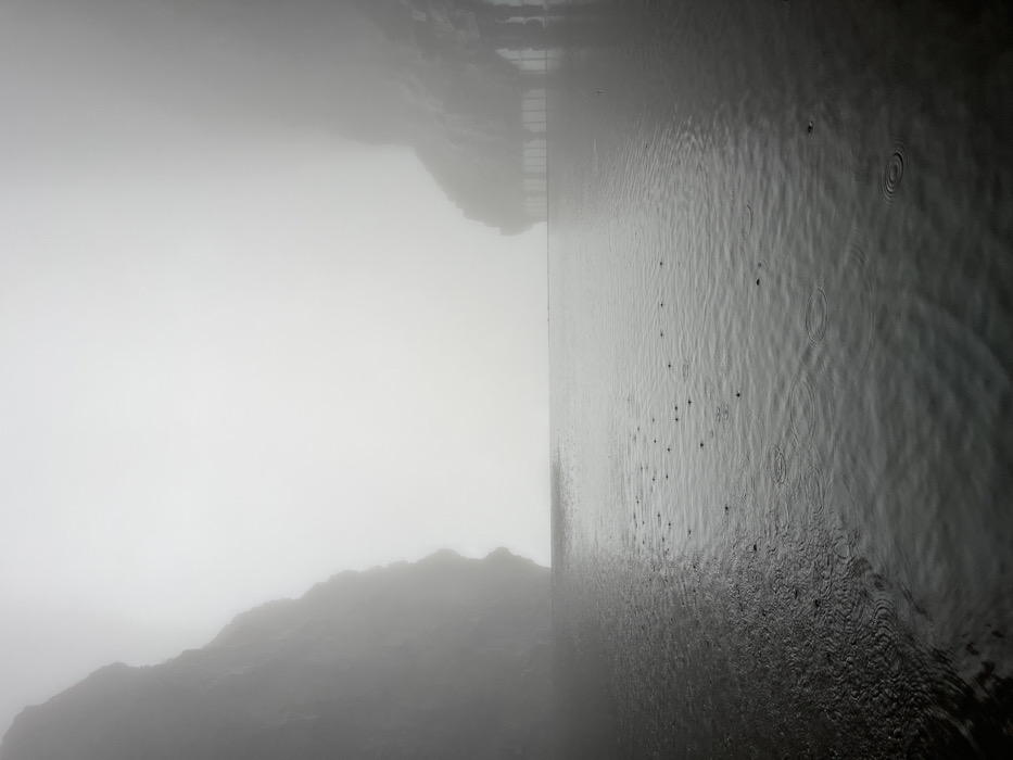 A grayscale image is split vertically, showing a misty landscape on the left and water on the right. The left side features a muted, foggy hillside, with blurred details. The right side presents water, actively disturbed by raindrops, creating ripples and a reflective surface. The division between the elements is stark.