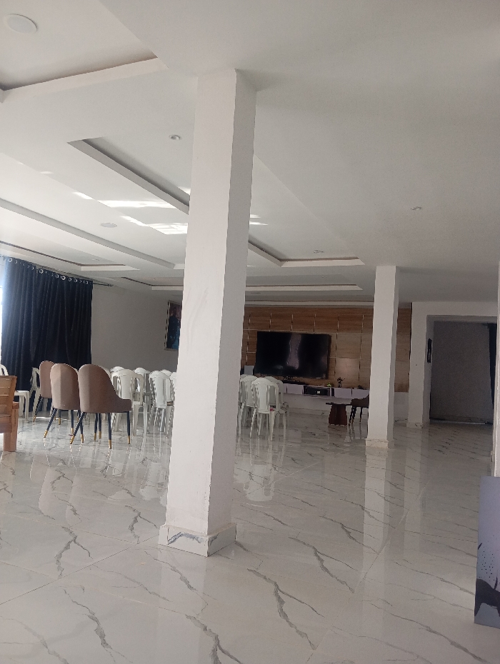 A spacious, brightly lit interior features white marble-patterned floors, white walls, and ceiling. Black curtains are partially visible on the left. Multiple chairs, some beige and some white, are arranged in rows. A large television is mounted on a wooden-paneled wall. Thick, square white pillars are placed throughout the space. The room appears to be set up for an event or meeting.