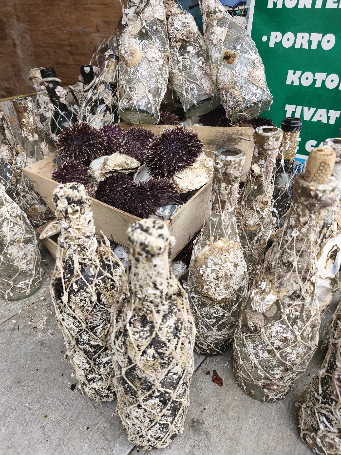 The scene in Dražin Vrt, Montenegro, depicts a collection of marine items displayed on a grey concrete surface. A light-colored wooden crate in the center contains numerous dark purple sea urchins with prominent spines and several light-colored oyster shells. Surrounding the crate, and extending into the foreground, are multiple glass bottles, varying in shape and color, heavily encrusted with white and beige marine growth, consistent with barnacles and other sessile organisms. Most bottles are partially enveloped in a coarse, light-colored netting, resembling a fishing net. Some bottles have cork stoppers in their necks, while others are open. In the background, a green sign with white capital lettering is partially visible, showing text fragments such as "MONTE...", "•PORTO", "KOTO...", and "TIVAT...". No individuals are present in the image.