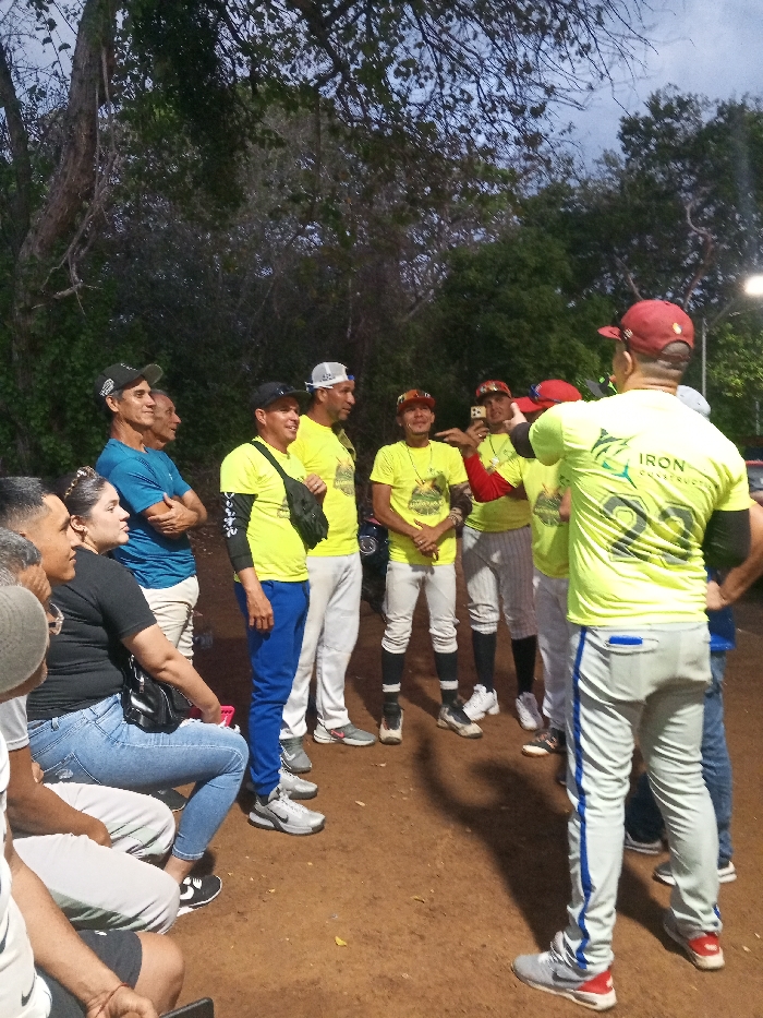 A group of baseball players and spectators gather in a dirt field, likely a baseball park. Many players wear yellow jerseys with the words "Iron Constructors" on the back. Some players are in baseball uniforms, others in casual attire. A man in a red cap faces the group, appearing to be addressing them. Trees and foliage form the backdrop under a brightening sky, suggesting either dawn or dusk.