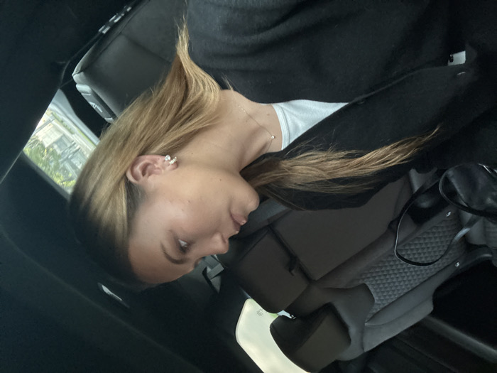 A woman with blonde hair is seated in a car, facing left. She wears a white top under a black jacket, and a delicate necklace is visible. Her left ear features a distinctive earring or ear cuff. The car's interior includes a patterned seat and a glimpse of the outside through the window. The image has a slightly tilted perspective.
