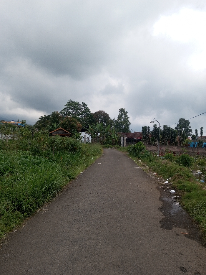 The scene depicts a narrow, dark grey asphalt road in Zeyathiri District, Myanmar, extending into the distance under an overcast sky. Dense green vegetation, including tall grass and leafy plants, borders both sides of the road. On the left, residential structures are visible amongst the trees, including a small building with a brown roof and a white building further back, with a blue and white structure faintly visible on a distant hillside. Various trees, including banana trees, are present. On the right, similar vegetation is interspersed with scattered white styrofoam debris and a small puddle of water near the road's edge in the foreground. A black pole with a curved street lamp is situated on the right side of the road, beyond which lies cultivated land or a garden with additional structures, including one with a reddish-brown roof. Overhead utility lines are visible in the upper right. The sky is uniformly grey with heavy cloud cover. No individuals or vehicles are present.