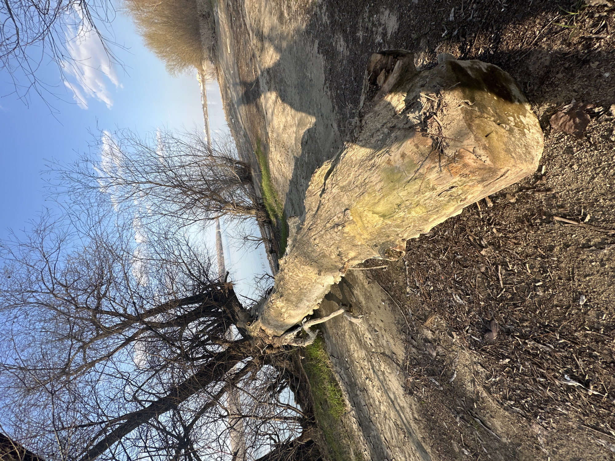 The scene depicts a riverbank in Silistra, Bulgaria, under a bright blue sky with scattered white clouds, likely during late winter or early spring due to leafless trees. A large, weathered tree trunk, partially debarked and light-colored, lies diagonally across the sandy-dirt foreground, extending from the base of a mature, dark-barked, leafless tree on the left towards the lower right. The ground surface shows patches of dry, cracked earth, loose soil, and leaf litter, with minimal green grass visible near the water's edge. Numerous other bare-branched trees and scrub vegetation line the sloping riverbank, which leads down to the calm, light-blue water of the Danube River. In the mid-ground, the distant opposing riverbank features faint buildings and additional vegetation. A long, distinct shadow of a standing individual, presumed to be the photographer, is cast on the sandy ground to the right of the fallen tree trunk, indicating low-angle sunlight.
