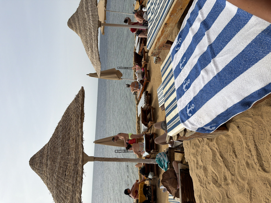 The image depicts a daytime scene on a sandy beach located in Sharm El Sheikh, Egypt. A light blue, slightly hazy sky meets a calm, blue-green sea that stretches towards a distant horizon. The foreground consists of light brown sand showing distinct footprints. Approximately ten wooden sun loungers are arranged on the sand, some equipped with striped cushions (blue and white, or plain beige). In the immediate foreground, a wooden sun lounger is covered with a blue and white striped towel featuring repeating anchor motifs. Multiple thatched parasols are present; at least two are open and providing shade, while one further back appears collapsed. Approximately ten to twelve individuals are visible, mostly engaged in leisure activities. * In the mid-left, a person wearing a wide-brimmed straw hat lies prone on a sun lounger. * Near the water's edge, a male in light-colored (possibly neon yellow) swim shorts stands, facing and appearing to interact with or apply a substance to the head or upper body of a female seated on a nearby lounger. * Other individuals are seated or reclined on loungers, dressed in swimwear, either facing the sea or interacting with companions. * One individual is partially submerged or wading in the sea on the left side of the frame.