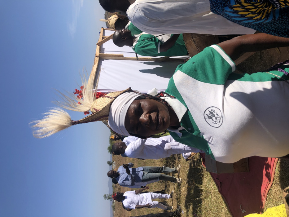 An outdoor gathering is depicted in Kerang, Nigeria, under a clear blue sky. A dark-skinned woman occupies the foreground, looking directly at the camera. She wears a white headwrap, an elaborate conical woven hat with a prominent white feather plume, and red decorative elements. Her attire includes a green and white short-sleeved polo shirt with a circular black logo featuring figures on horseback. Her left arm is partially visible. In the mid-ground, several individuals are present. To the left, men in white traditional attire stand on dry, yellowish-brown grass. One man in a light blue collared shirt and jeans holds a smartphone. To the right of the central woman, men in green polo shirts, similar to hers, are visible, with one holding a drum. A makeshift structure constructed from a wooden frame and white fabric panels stands behind this group. The ground in the foreground and mid-ground is covered with dry grass, and a red mat with a light brown wooden box rests on it. Distinct shadows are cast, indicating bright sunlight. Distant, hazy hills are visible on the horizon.