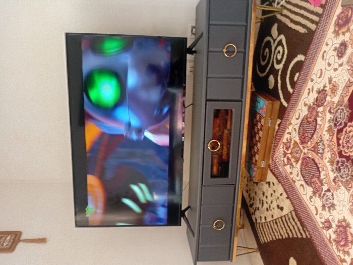 This image depicts an indeterminate indoor location within the city of Unknown, Unknown, focusing on an entertainment setup. A black flat-screen television is centered on a dark gray, modern television stand. The TV displays animated content featuring a character with large green eyes; a "MBO" logo is visible in the upper left of the screen. The television stand has two closed drawers, one on each side, each fitted with a circular gold ring pull handle. The central section features a transparent panel revealing horizontal textured elements within, and it also has a matching gold ring pull handle. The stand is supported by four slender, gold-colored, angled legs. Beneath the central section of the TV stand, a wooden decorative box, possibly a game board, with a checkered lid and blue accents, rests on the floor. The floor is covered by two layered rugs. The foreground rug is cream-colored with an intricate, symmetrical floral and vine pattern in shades of maroon, pink, and green. A darker brown rug with large, abstract cream-colored spiral patterns is visible beneath and behind the TV stand. The background consists of a plain, light-colored wall, with a small, rectangular, light-brown wooden decorative plaque featuring a tassel hanging in the upper left quadrant of the image. No people are visible, and all objects are static.
