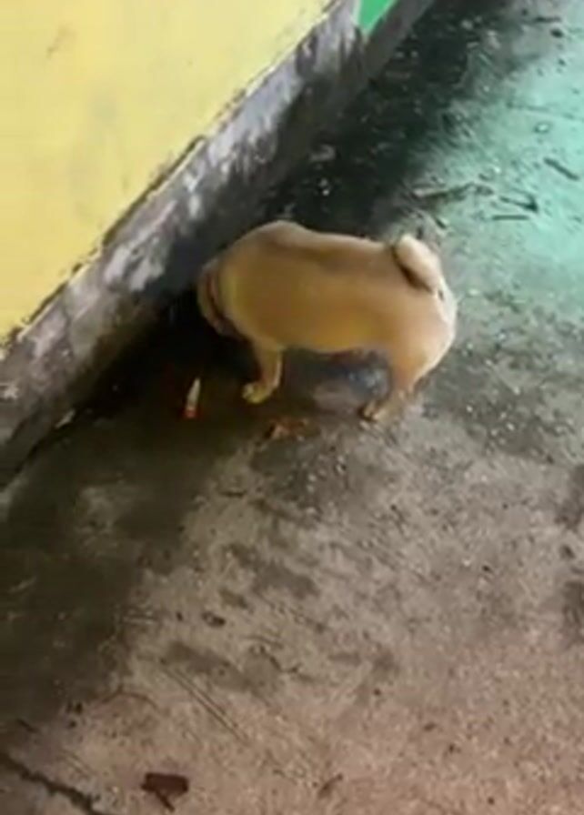 light-colored pug sniffing the corner of a yellow and green wall on an overcast day. The pug wears a red collar with yellow trim. The ground is concrete with scattered debris.