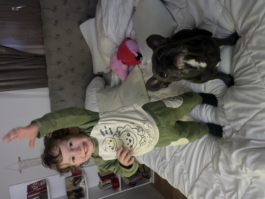The image depicts an indoor scene, specifically a bedroom, in Vratsa, Bulgaria. A young child with curly brown hair and fair skin stands on a bed, smiling at the camera with their left arm raised in a waving gesture. The child is wearing a two-tone long-sleeved shirt with an off-white torso featuring cartoon characters (a figure atop a lion with "hanging with my bestie" and "MINI SMILLEY" text) and green sleeves, paired with green sweatpants that have off-white knee and pocket patches, and black socks. To the child's right, a dark brindle or black French Bulldog with white chest and chin markings stands on the bed, looking upwards towards the camera. The bed is covered with a white quilted duvet. Multiple pillows are scattered on the bed, varying in color from white to light grey. A pink Peppa Pig plush toy in a red dress lies on the bed near a light grey pillow, positioned towards the headboard. In the background, a large, grey, tufted headboard spans the width of the bed. Dark grey curtains are visible on the right side of the frame. To the left, a white floating bookshelf unit displays various books and framed photographs. Above the bookshelf, a small macrame wall hanging is present.