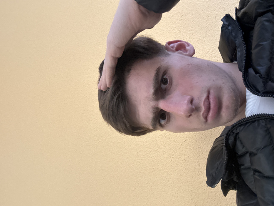 - "A young adult male, of apparent Caucasian ethnicity, is depicted in a close-up, chest-up shot against a plain, light yellow-orange textured wall" by FM-DELcs2, licensed under CC BY 4.0