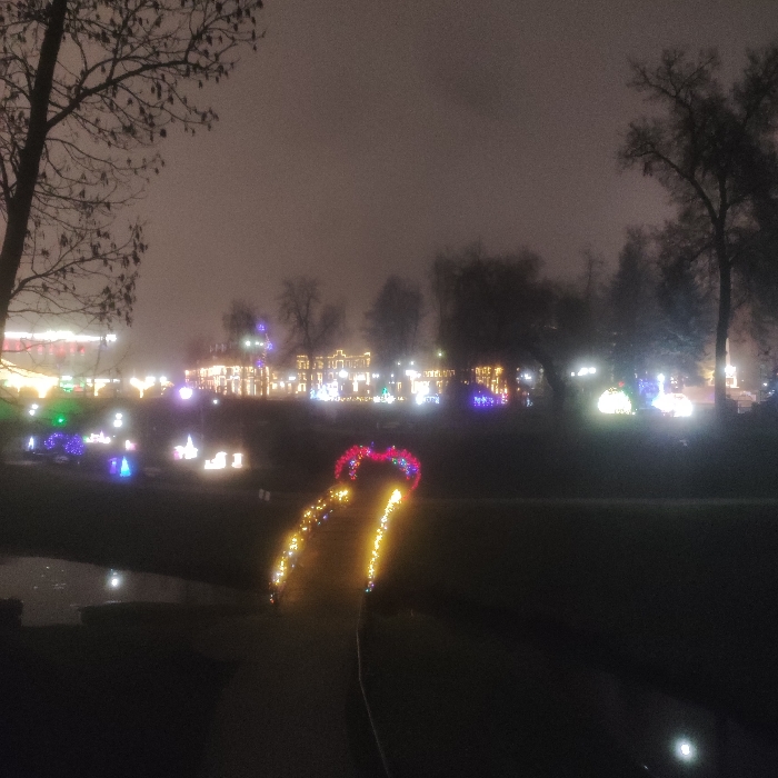 A dark, foggy night scene shows a park illuminated with holiday lights
