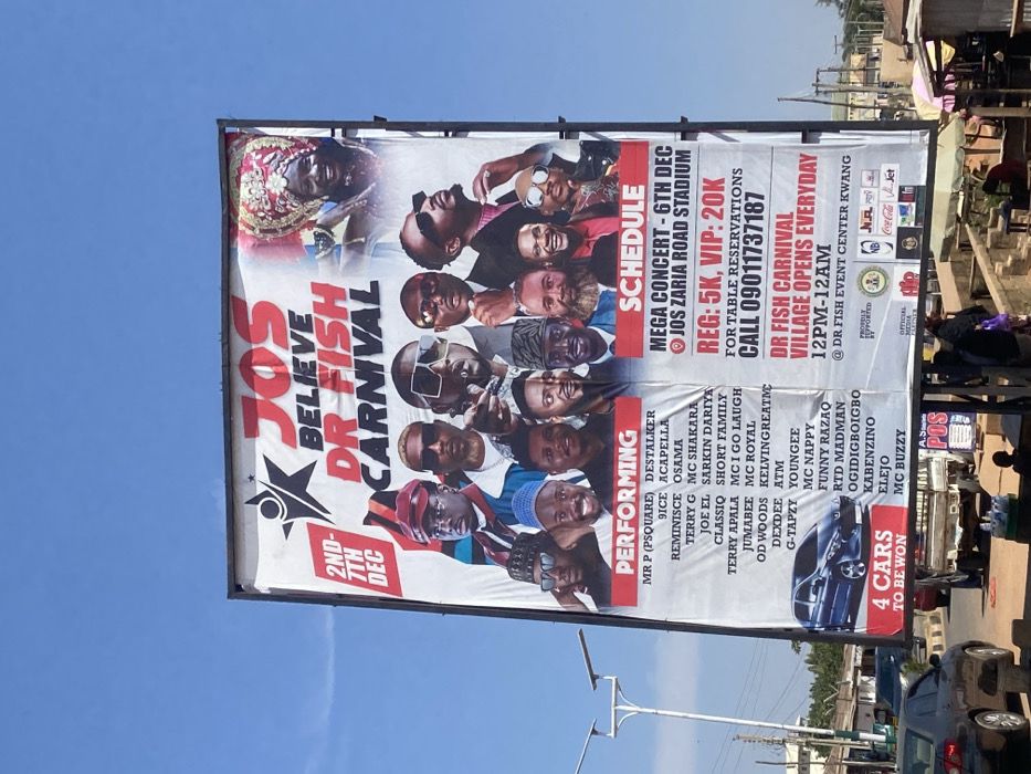 A large billboard advertising the "JOS BELIEVE DR FISH CARNIVAL" stands prominently on the side of a multi-lane road in Jos, Plateau State, Nigeria, under a clear blue sky
