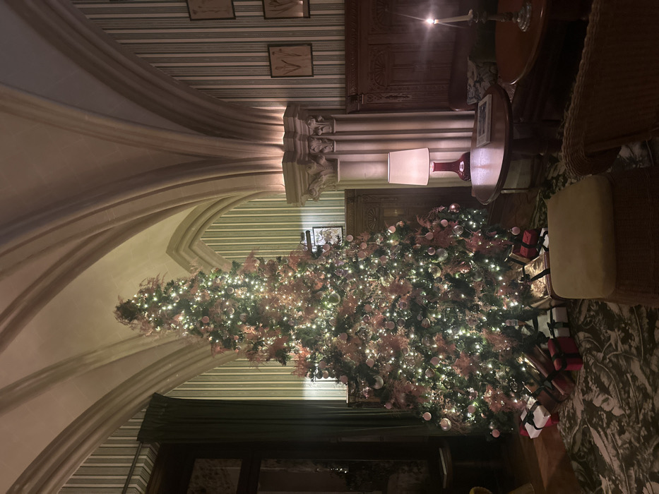 A large Christmas tree adorned with lights and ornaments stands in a room with arched ceilings