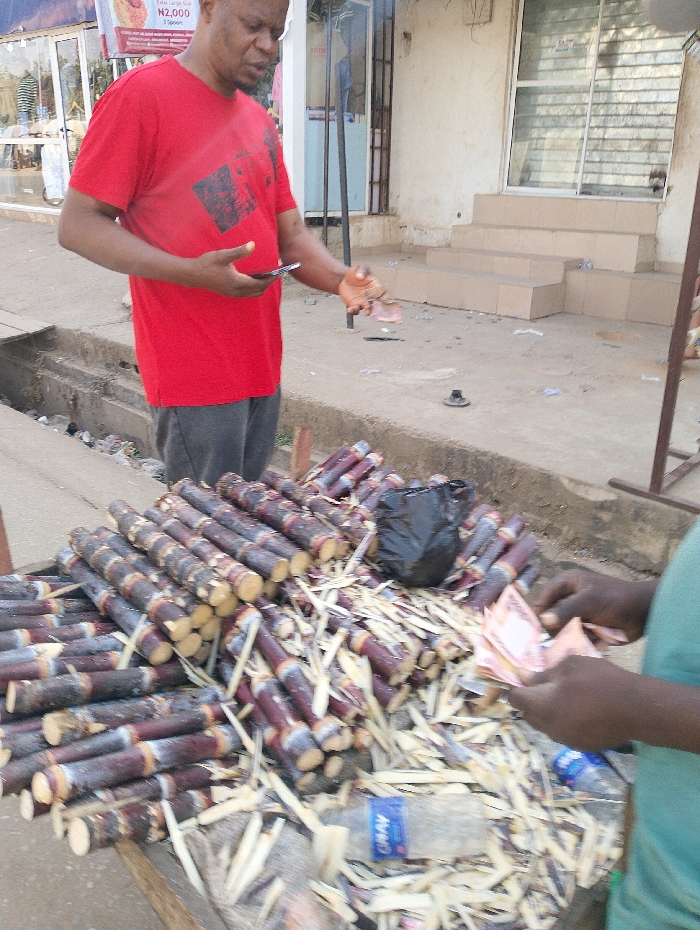 This image depicts a street vending scene in Kubwa, Nigeria. A male vendor, wearing a red t-shirt with a dark graphic and dark trousers, stands behind a stall, holding a black smartphone in his left hand and currency notes in his right. His gaze is directed downwards. In the foreground, the dark-skinned hands of another individual are visible, counting or holding multiple Nigerian Naira currency notes. The stall, likely a makeshift wooden structure, is covered with numerous cut segments of sugarcane, primarily dark reddish-purple with lighter, exposed ends. These segments are piled in stacks and loose arrangements. A significant quantity of light-colored sugarcane peelings is scattered across the stall surface and around the base of the sugarcane piles. A small, crumpled black plastic bag rests amidst the sugarcane. At least two plastic water bottles, one branded "CHIVAY," are also present on the stall. The environment includes a concrete ground surface. An open drainage ditch containing some refuse runs along the left side of the frame. In the background, a light-colored building with a multi-step entrance and large windows is visible. To its left, another building features a glass storefront displaying clothing and a partially visible banner indicating "TOTO LARGE SIZE N2,000 1 SPOON." The scene is illuminated by daylight, suggesting an outdoor setting.